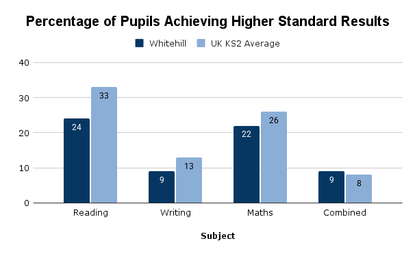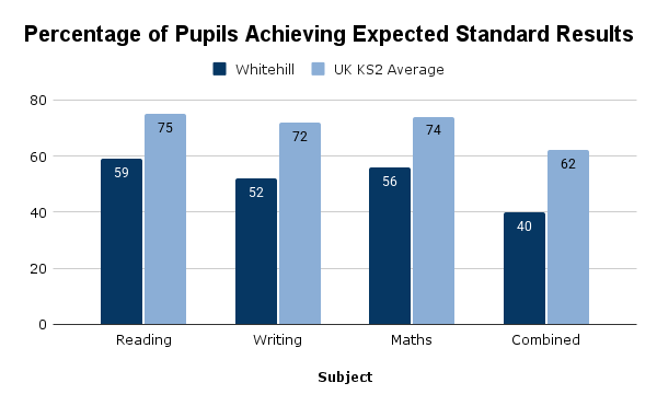 Every year, pupils are assessed on their attainment; below are Whitehill Primary School's results compared to the national headline results of the assessment of Key Stage 2.