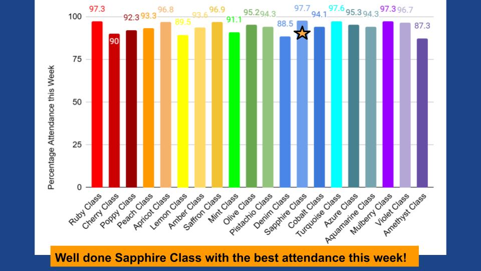 This week, the class with the best attendance is Sapphire Class. Well done Sapphire Class! Keep up the good work!