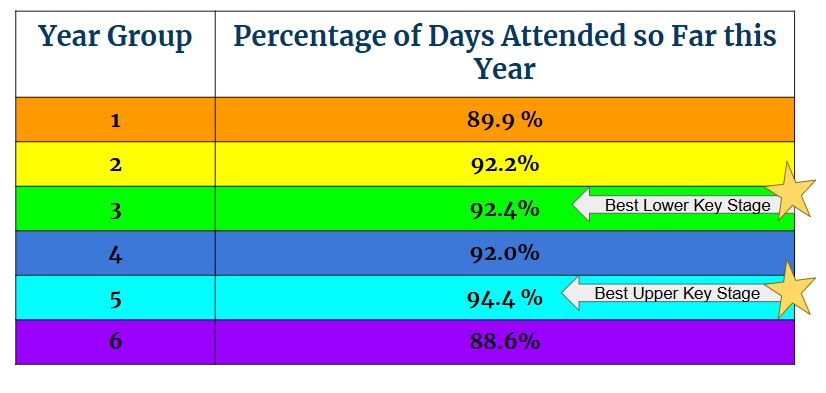 Below, you can see this week's attendance data. The stars indicate the year groups who were awarded 5 minutes extra Green Time for topping everyone else's attendance: