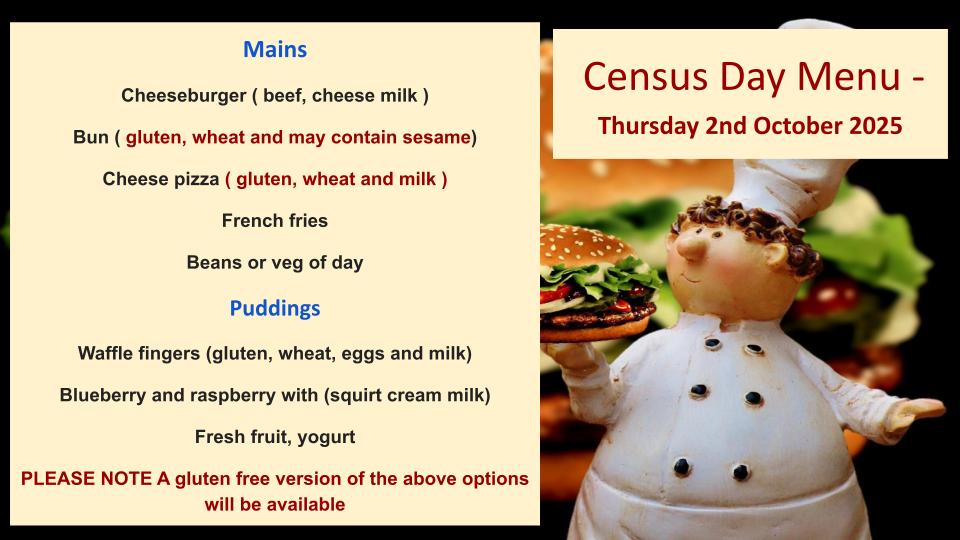 Thursday 2nd October is Census Day. Essentially, the greater the number of students in school having a school dinner, the greater our school funding will be for the year ahead.
