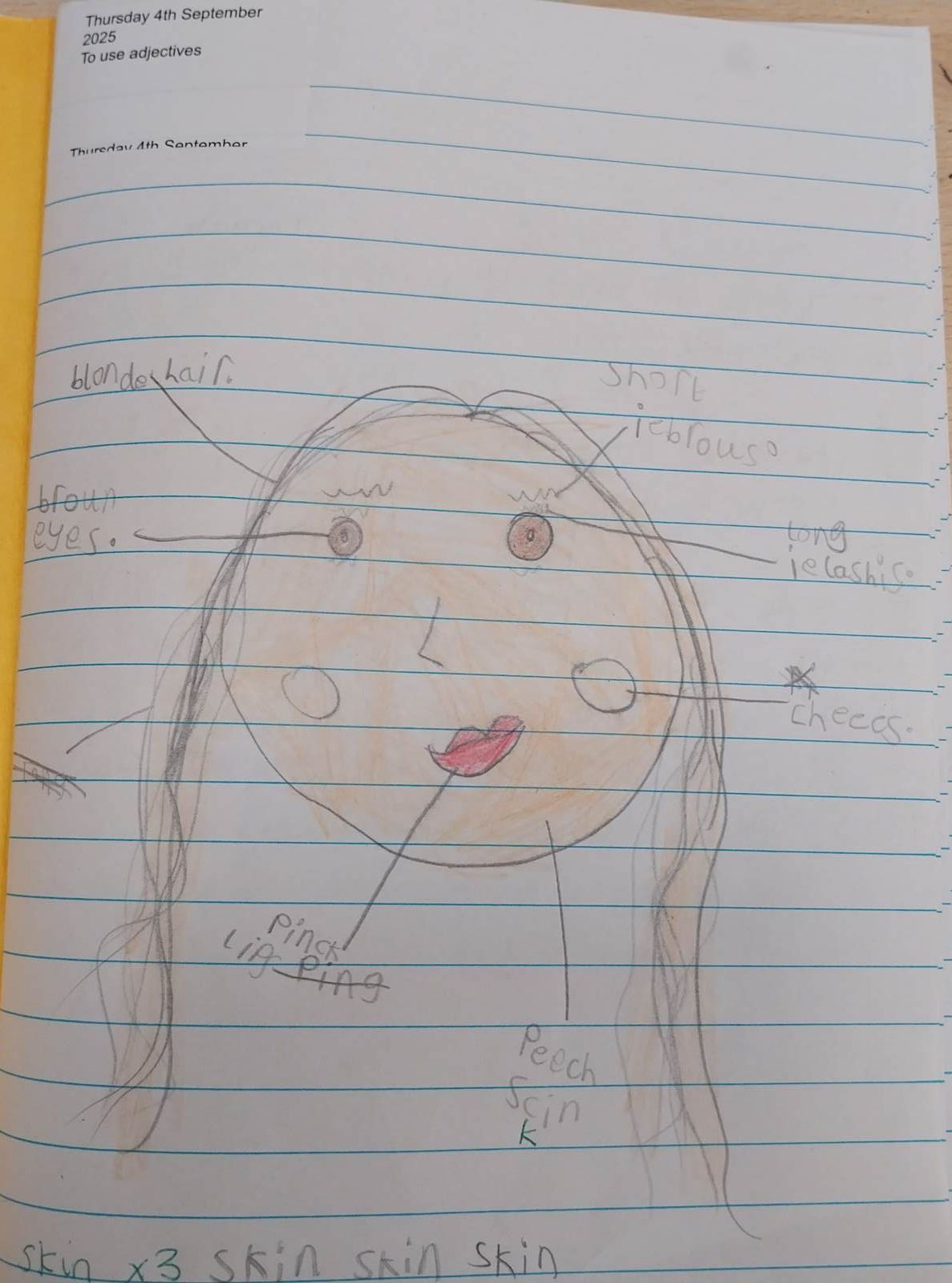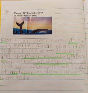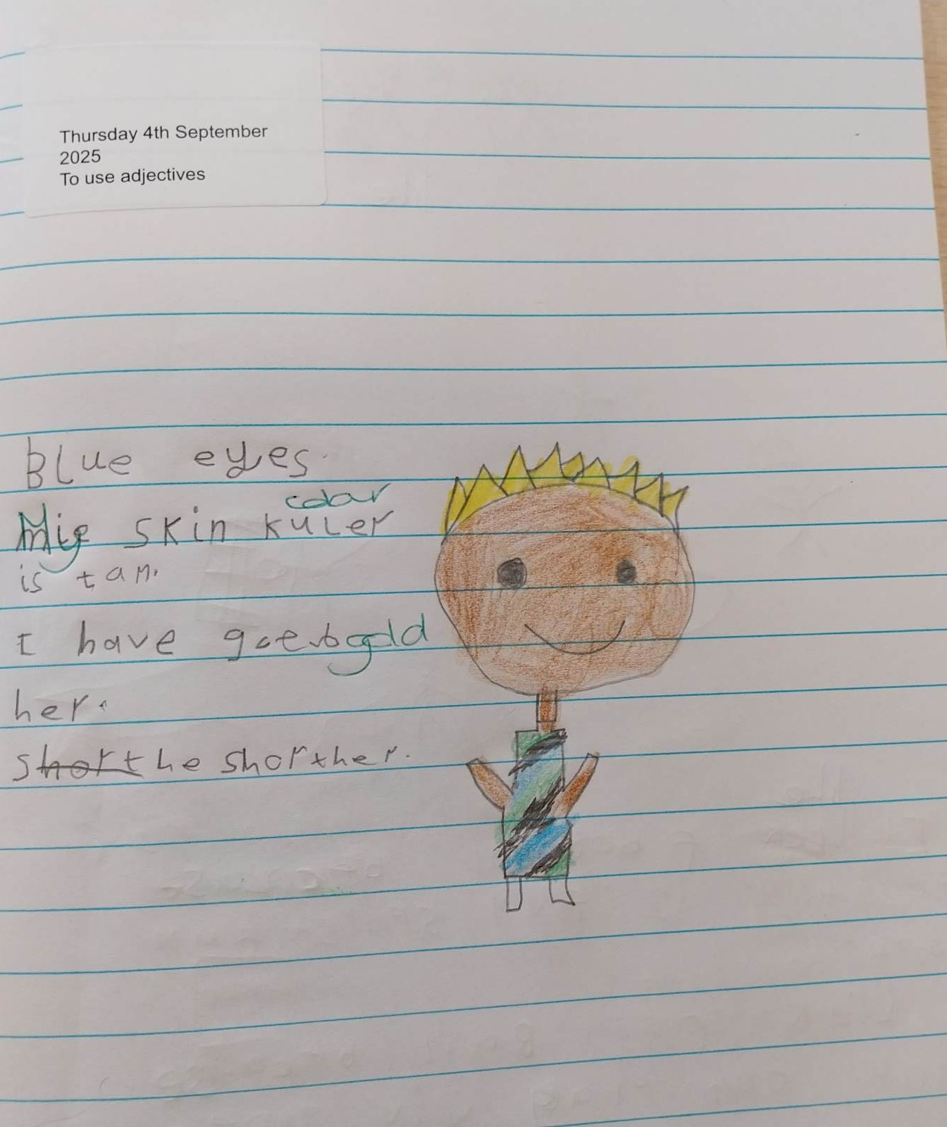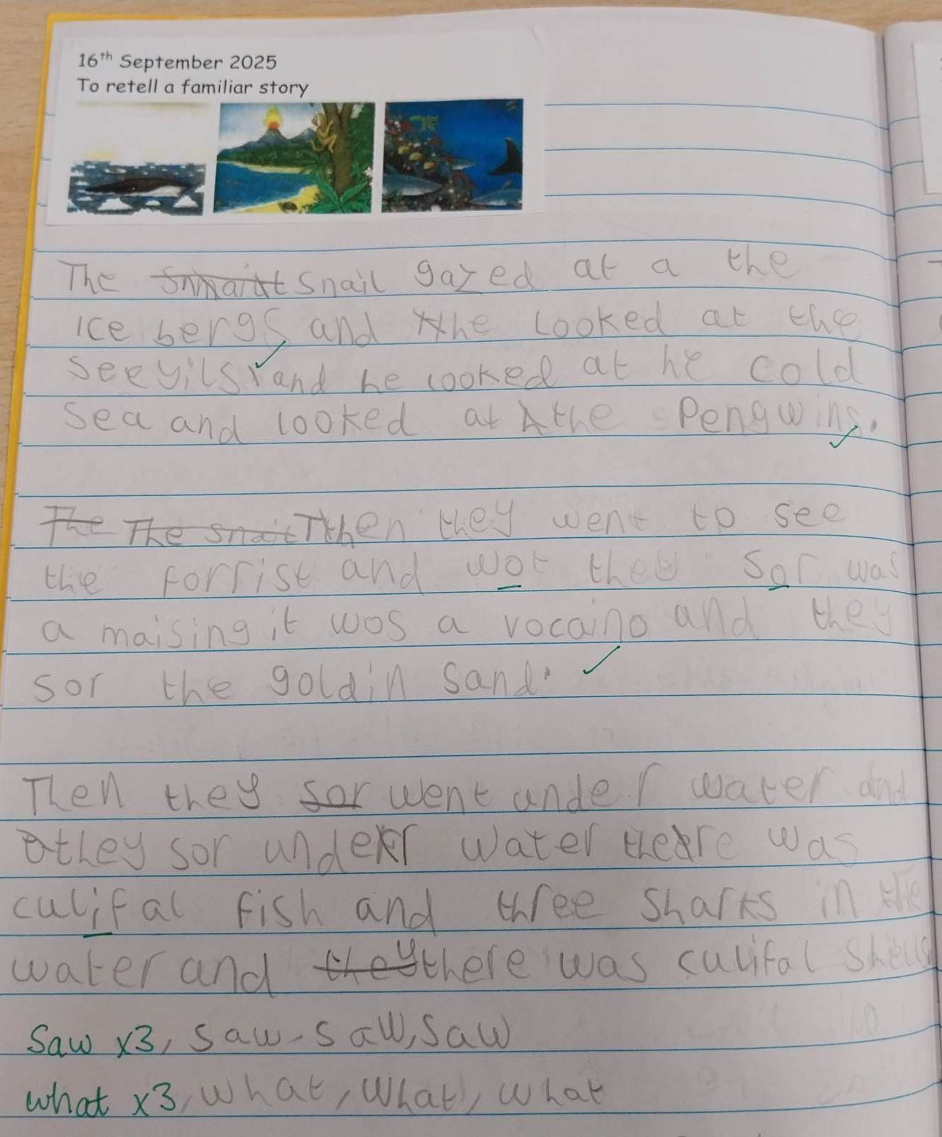 This week, we have had a special treat looking at our Year 2 students' writing progress. Having taken a look at their first piece of writing which was a labelled picture of their faces and compared this to their most recent 'Snail and the Whale' inspired work, the progress is significantly impressive. Well done Year 2!