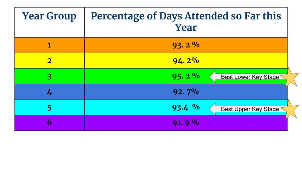 Below, you can see this week's attendance data. The stars indicate the year groups who were awarded 5 minutes extra Green Time for topping everyone else's attendance: