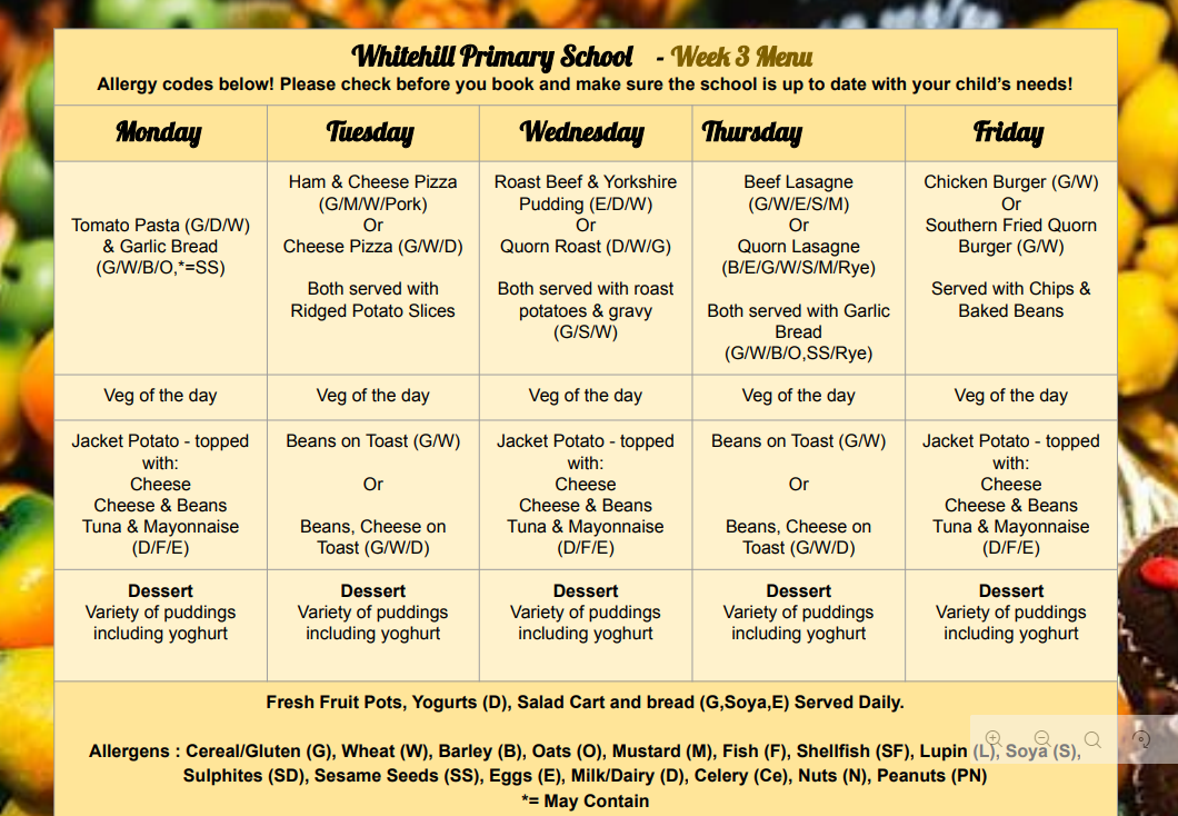 potatoes, pasta, rice), vitamins and minerals for a healthy immune system and organ function (fruit and vegetables) and a source of dietary fibre (fruit and vegetables and salad). All our kitchen team meet the requirements of health and safety, and all of the ingredients bought into the kitchen are checked for suitability in relation to allergens. School lunches can be booked and paid through Arbor.